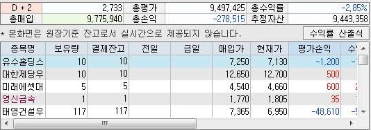 그리고 나서 잔고를 확인해 보면, 총 손익이 25만원 손해로 나와 있는 것을 볼 수 있었습니다. 이래서는 순 이익이 이 이상을 상회해야 이익이 나왔다고 말할 수 있습니다.
