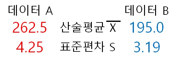그래서 산술평균과 표준편차를 구하면, 위 스크린샷과 같은 결과를 얻을 수 있습니다. 일단 표준편차가 크다고 해서, 단순히 관측 데이터 A가 평균에서 데이터가 더 많이 분산이 되었다고 할 수 있느냐 하면, 그건 아니라고 할 수 있습니다. 왜냐하면 데이터의 전체적인 관측값이 크기 때문에, 혼선이 일어날 수 있기 때문입니다. 그래서 이런 상황과 같이 데이터의 산술평균이 다른 경우, 얼마나 데이터가 평균에서 흩어져 있는지 정도를 알아보기 위해 필요한 지수가 바로 '변동계수'인 겁니다.