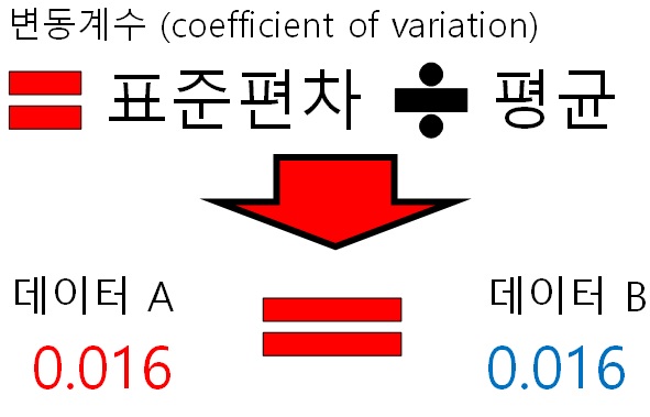 변동계수를 계산하는 방법은 간단하게도 표준편차를 산술평균으로 나누기만 하면 됩니다. 이렇게 해서 나온 변동계수를 한번 계산해 보면, 표준편차가 더 크다고 해서 흩어진 정도가 더 많이 흩어진게 아니라, 실은 같은 수준으로 흩어져 있다는 것을 알 수 있습니다.