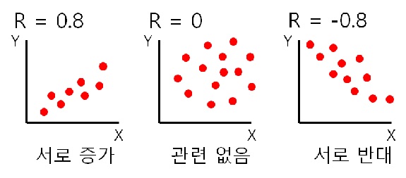 일단 피어슨의 적률상관계수는 -1에서 1사이의 값을 가지며, 0에 가까울 수록 두 변수간에 아무런 관계가 없음을 말하고 있습니다. 그리고 위 그림에 표시된 R이라는 값이 1에 가까워 질수록 양의 상관관계라고 해서 한쪽이 커지면 다른 한쪽도 커지는 관계가 됩니다. 반대로 -1에 가까울 수록 음의 상관관계라고 해서, 한쪽이 커지면 다른 한쪽은 반대로 작아지는 관계가 되는 것 입니다.