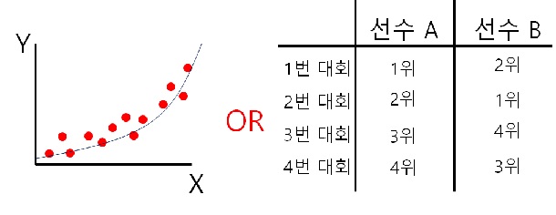 그런데 이런 상관계수를 그냥은 사용할 수 없는 경우가 있습니다. 대표적인게 위 그림의 경우라고 할 수 있는데, 두 변수의 상관관계가 곡선을 그리는 것이 예상이 되거나, 우측의 도표처럼 데이터가 순위 데이터라고 해서 대회에서 거둔 순위만 있는 경우가 해당이 됩니다. 이런 경우는 순위상관계수 (coefficient of rank correlation) 을 사용해야 합니다.