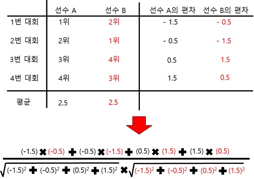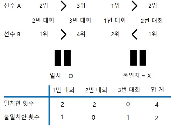 다음은 켄달의 순위상관계수를 구하는 방법입니다. 이 방법은 먼저 위 스크린샷처럼 두 선수의 각각의 대회별로 우열이 일정했는지, 역전이 되었는지를 한번 고려해서 우열이 언제나 일정한 경우를 일치한 횟수, 불일치한 횟수를 계산해야 합니다.