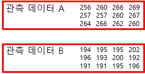 먼저 관측 데이터 A와 B에 대해서 한번 이야기를 하도록 해 보겠습니다. 일단 A와 B는 데이터의 크기가 서로 다르다는 것을 얼핏 보면 보입니다.