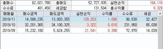 먼저 실현손익을 처음 이 실험을 시작한 9월 부터 한번 보도록 합니다. 이렇게 해서 보는 이익이 전체적으로 16만원 정도가 나왔다는 것을 확인하도록 합니다.