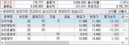 그리고 나서 당일 실현 손익을 계산해 보면, 상황은 좋지 않게도 작지만 손해가 나오는 것을 확인할 수 있었습니다. 이래서는 상황이 좋지 않습니다.