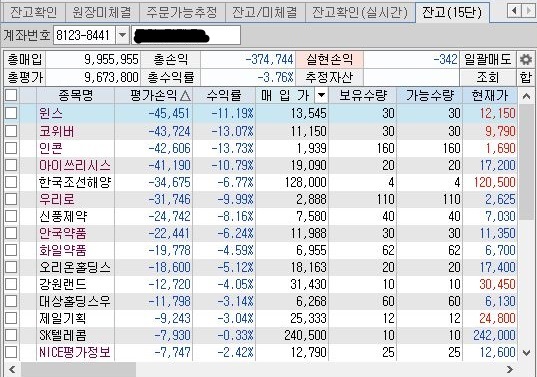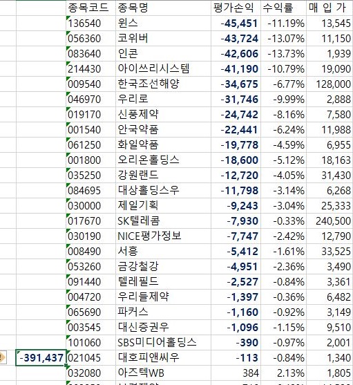 그리고 나서 잔고 15단에서 나온 내용을 가지고서 한번 작업을 실행해 보도록 합니다. 일단 손해란 손해는 모두 합쳐서 39만원이 넘는 다는 것을 알 수 있었습니다.