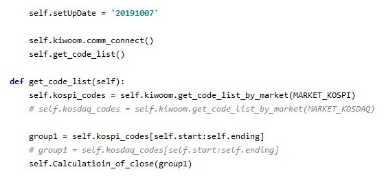 다음으로는 정보를 얻어오기 위해서 일단 엑셀에 정리를 하였는 결과에서 필요한 종목의 코드를 일일히 입력하도록 합니다.