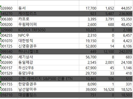 먼저 종목들 중에서 펀드로 보이는 종목과 1000원 미만의 종목은 모두 제외하도록 합니다. 이렇게 하는 것으로 일단 2차적인 작업이 끝나기는 했습니다.
