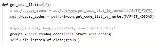 다음으로는 정보를 얻어오기 위해서 일단 엑셀에 정리를 하였는 결과에서 필요한 종목의 코드를 일일히 입력하도록 합니다.