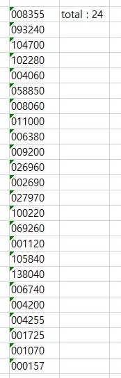 이렇게 해서 위 스크린샷에서 보이는 24개의 종목이 선정되는 것을 확인할 수 있었습니다. 코스닥의 종목을 어떻게 하지 못하는 것이 아쉽기는 하지만, 그래도 코스피만 가지고서 이제 다음 실험의 과정에 들어가 보도록 합니다. 일단 이번 포스팅에서는 그 준비단계가 여기까지 왔다는 것을 언급하고자 합니다.