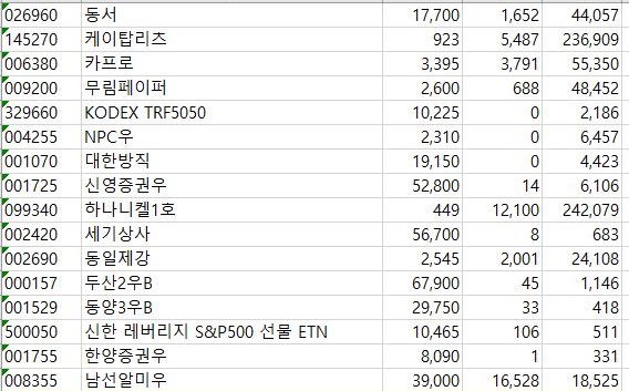 먼저 종목들 중에서 펀드로 보이는 종목과 1000원 미만의 종목은 모두 제외하도록 합니다. 이렇게 하는 것으로 일단 2차적인 작업이 끝나기는 했습니다.
