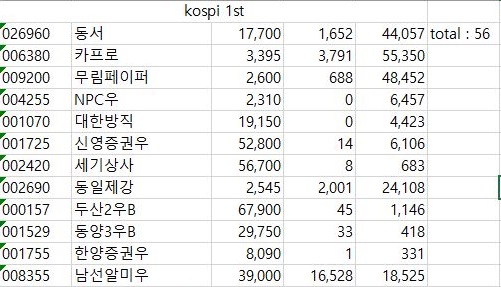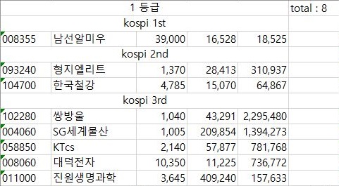 일단 먼저 종목의 리스트를 위 스크린샷과 같이 엑셀에서 정렬을 하도록 합니다. 이렇게 하는 것으로 이제 1차적인 작업은 끝내는 데는 성공했습니다.