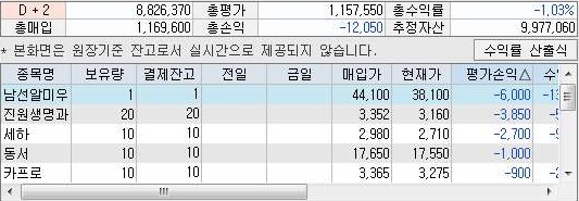 다만 이런 상황이 되었음에도, 잔고를 확인해 보자면, 주식을 매도해서 발생한 수익에 비해서 이미 매수한 주식이 폭락해서 발생한 손해가 더 큰 상황이라는 것을 알 수 있었습니다.