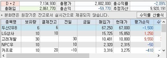 그리고 나서 한번 실험군의 잔고를 확인해 보았는데, 일단 실수로 매수가 된 종목 때문인지 몰라도 더 총 수익률이 줄어든 것을 확인할 수 있었습니다. 이래서야 상황이 좋지 않은데, 아무튼 간에 이러니 저러니 해도, 이번 실험에서 아직 결론을 내기에는 너무 이르다는 생각이 듭니다.