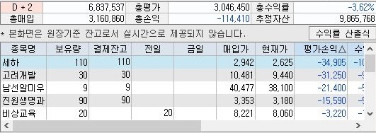 하지만 이런 것도 잠시, 문제는 실험군 역시 잔고를 확인해 보면, 위 스크린샷처럼 총 수익률이 마이너스인 것을 확인할 수 있었습니다. 왜 이런 결과가 나오는 가 하면, 일단 다른 종목에서 갉아먹는 손해가 하루종일 실현시킨 손익을 상쇄하다 못해 더 내려가기 때문에 벌어지는 결과라고 할 수 있습니다.