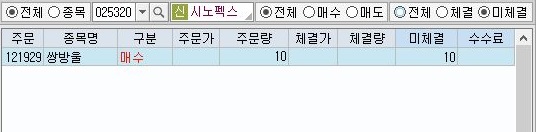 그리고 나서 한번 이날은 미체결이 나왔는지 여부를 살펴 보도록 하겠습니다. 이렇게 해서 나온 미체결이 한 종목에서 나왔는 것을 확인할 수 있었습니다.