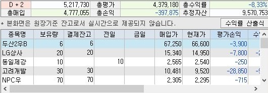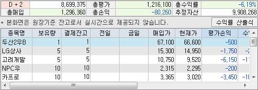그리고 나서 다음으로 잔고를 확인해 보니, 위 스크린샷에서 알 수 있는 것처럼 일단 총수익률이 상당히 내려가 있는 것을 확인할 수 있었습니다. 이래서야 이걸 어떻게 해야 할지는 모르겠습니다만, 아무튼 간에 계속해서 이 내려가고 있는 상황이 얼마나 될지 모르겠습니다.
