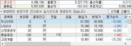 일단 문제라면 문제인 것이 총수익률이 상당히 좋지 않다는 것을 볼 수 있습니다. 그래도 지지난번의 마이너스 8%정도였는데, 그보다는 떨어졌지만, 그래도 손해를 계속해서 보는 것은 볼 수 있습니다.