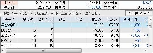 일단 문제라면 문제인 것이 총수익률이 상당히 좋지 않다는 것을 볼 수 있습니다. 그래도 지지난번의 마이너스 8%정도였는데, 그보다는 떨어졌지만, 그래도 손해를 계속해서 보는 것은 볼 수 있습니다.