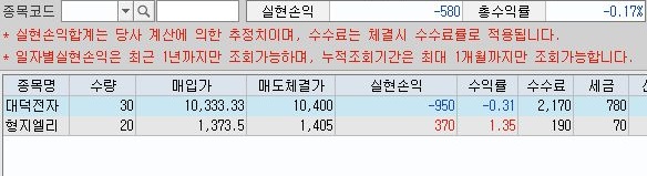 그리고 나서 당일 실현 손익을 한번 살펴보니, 위 스크린샷과 같이 일단 실현된 이익은 상당히 쥐꼬리 만하게 나오는 것을 확인할 수 있었습니다.