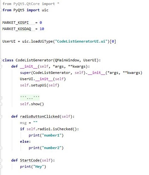 그리고 나서 다음으로는 UI만 있다고 해서 작동을 하는 것이 아니라, 이제는 제대로 내용물이 있어야 합니다. 그래서 먼저 kiwoom.py를 가지고 오도록 하고, 일단 키움증권 서버에 접속을 하도록 해 줍니다. 그리고 나서 버튼과 토글 스위치를 누르면 반응을 하도록 메서드를 지정해 주도록 합니다.