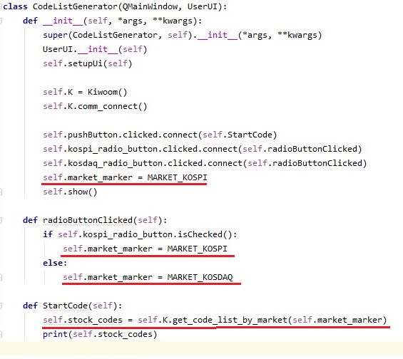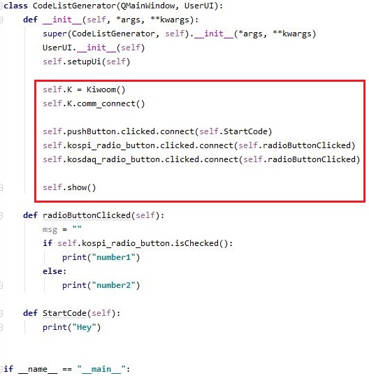 그리고 나서 다음으로는 UI만 있다고 해서 작동을 하는 것이 아니라, 이제는 제대로 내용물이 있어야 합니다. 그래서 먼저 kiwoom.py를 가지고 오도록 하고, 일단 키움증권 서버에 접속을 하도록 해 줍니다. 그리고 나서 버튼과 토글 스위치를 누르면 반응을 하도록 메서드를 지정해 주도록 합니다.