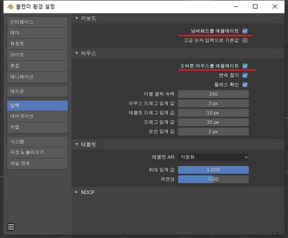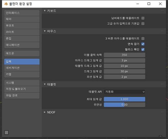 그리고 나서 선택 주위에 오비트라는 항목을 클릭해서 카메라가 나중에 화면에서 선택된 오브젝트를 중심으로 회전할 수 있도록 만들어 주도록 합니다. 이렇게 원래라면 간단하게 끝이 날 것으로 예상을 했지만, 그래도 어떻게 오랜 시간이 걸리게 되었는 블렌더의 환경설정 작업이 일단 마무리가 되었습니다. 이제 자습서를 따라 해 보면서 본격적으로 3D 오브젝트를 먼저 그려 보도록 하겠습니다.