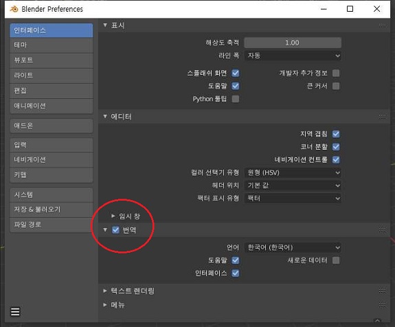 그리고 나서 지역겹침이라는 항목이 인터페이스 항목에 가면 있는데, 이게 바로 region overlap이라고 하는 항목으로 툴바 메뉴가 뜰때 화면이 요동치는 것을 막아주는 항목인데, 기본적으로 되어 있는 것을 볼 수 있었습니다.