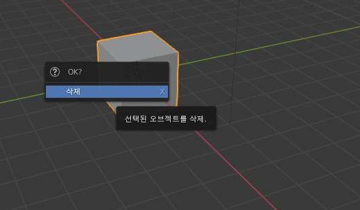 오브젝트를 선택한 다음 x키를 누르면 삭제할 것인지에 대해서 물어보는데, 이렇게 해서 삭제를 먼저 시키도록 합니다.