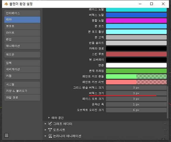 그리고 나서 테마에 가면 나오는 3D뷰 항목에서 위 스크린샷을 보시면 알 수 있듯이 툴바 등의 색상이나 투명도를 지정할 수 있는데, 일단 지금은 그대로 가도록 합니다.