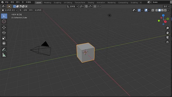 이제 새로 시작을 해서 나오는 화면에 블렌더는 언제나 사각형 상자가 중앙에 있습니다. 이게 좋을 수도 있지만, 귀찮아 질 수도 있기에, 일단 이를 없애도록 먼저 위 스크린샷처럼 일단 마우스 우클릭 으로 상자를 선택하도록 합니다.