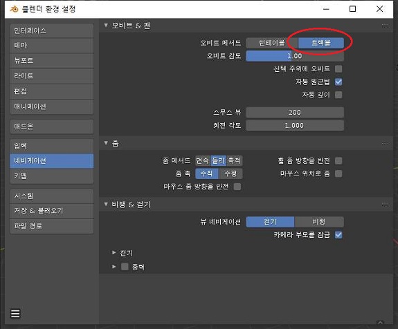 그리고 블렌더가 2.81 버전으로 업데이터가 되면서 이렇게 해서 나오는 것인지 모르겠습니다만, 일단 위 스크린샷에서 볼 수 있는 것처럼 오비트 메서드를 트렉볼로 바꾸어 주도록 합니다.