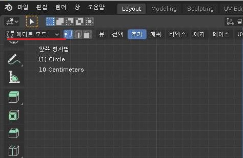 이 상태에서 위 스크린샷처럼 원형을 하나 추가해 주도록 합니다. 이게 중요한데 추가할 상황에서 반드시 3D뷰가 에디트 모드로 되어 있어야 합니다.