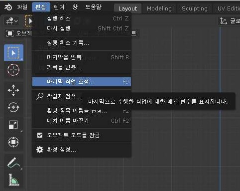 그래서 해결책을 찾기 위해서 한참을 헤메었는데 의외로 해결책은 가까운 데 하나 있었습니다. 우선 위 스크린샷에서 보이는 것처럼 오브젝트모드라고 되어 있던 것을 에디트 모드로 바꾸어 주도록 합니다.
