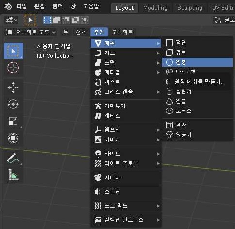 먼저 위 스크린샷처럼 추가 메뉴에서 메쉬를 선택, 원형을 선택하도록 합니다. 이렇게 하면 다음 스크린샷과 같이 일단 하나 나오게 됩니다.