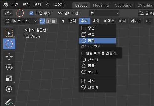 이 상태에서 위 스크린샷처럼 원형을 하나 추가해 주도록 합니다. 이게 중요한데 추가할 상황에서 반드시 3D뷰가 에디트 모드로 되어 있어야 합니다.