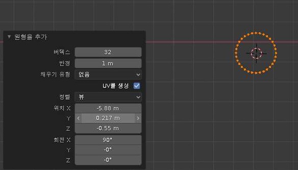 일단 3D 커서가 있는 곳을 중심으로 해서 바닥에 원형이 하나 생기는 것을 확인할 수 있기는 있었습니다. 문제는 이렇게 해서 이걸 다른 방향에서 보는 상황에서 수직으로 세우는가 하는 것 입니다.
