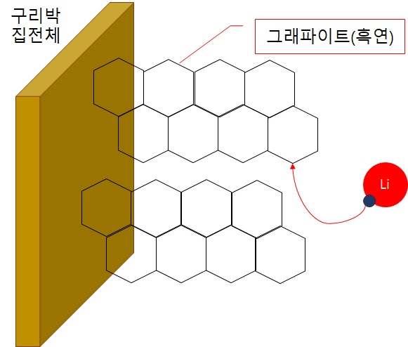 그리고 -극인 음극에는 집전체라고 해서, 전자를 모으는 역할을 전통적으로 구리가 핮3ㅣ만, 특이하게도 '그래파이트(grapite)'라고 불리는 '흑연'을 사용하고 있습니다. 저는 그전에는 몰랐습니다만, 전기 전도성이 상당히 좋아서 전기 용광로 등의 전극에 자주 사용이 되었다고 합니다. 말 그대로 리튬 이온의 전자가 전도성이 좋은 흑연에 붙어서 구리판에 모인 다음, 이게 전선이나 회로를 통해서 흘러가게 한다는 것을 알 수 있습니다.
