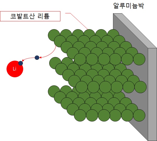 양극에서는 집전체로 구리가 아니라 알류미늄박이 사용이 되며, 여기서 모인 전자는 특이하게도 코발트산 리튬이라는 물질에 들어가서 전해질인 유기 용매속을 떠 다니고 있는 리튬 이온에 가서 붙게 됩니다. 당연하다면 당연하게도, 여기 양극(+극)에서 전자를 받은 리튬이온은 다시 분리막인 새퍼레이터를 지나서 음극에 간 다음, 전자를 내 놓게 될 것입니다.