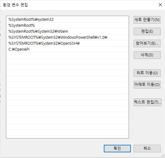 제 경우에는 그냥 OpenAPI라고 C 드라이브에 그냥 깔려있는 형태였기 때문에, 그대로 그냥 새로 만들기 항목을 사용해서 시스템 path항목에 추가해 주기만 하면 되었습니다.
