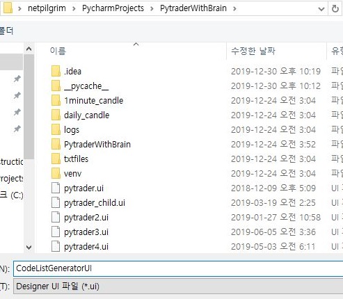먼저 위 스크린샷과 같이 일련의 코드를 작성해 주도록 합니다. 이전에는 UI를 코드로 구현했다면, 이번에는 위 스크린샷에서 보이는 것처럼 ui파일을 이용하도록 합니다.