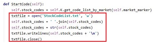 이번에는 저장이 가능하도록 한번 코드를 추가해 주도록 합니다. 이렇게 함으로서 제대로 txt파일에 코스피나 코스닥의 리스트가 저장이 되면 됩니다.