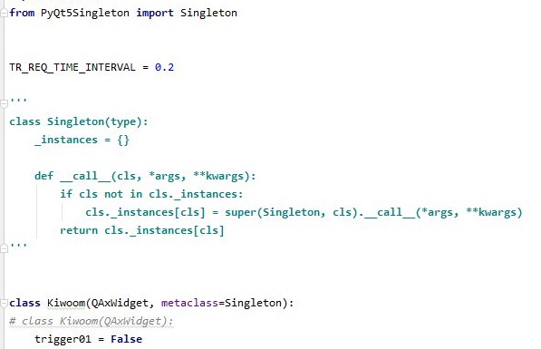 일단 실행이 안 되어서 어디가 문제인가 생각해 보니, 우선 kiwoom.py를 싱글턴으로 만들어 주지 않았다는 것을 알았습니다. 그래서 싱글톤으로 만들어 줍니다. 그런데 그러도고 문제가 해결되지 않았습니다.