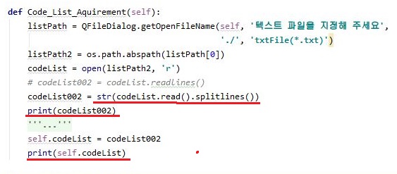 일단 splitlines()라는 함수가 핵심이라고 할 수 있으며, 여기서 나오는 코드의 리스트가 최종적으로 전달도 제대로 되는지를 한번 살펴보고자 print함수를 2개 사용했습니다.