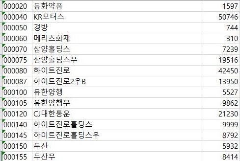 먼저 위 스크린샷과 가팅 일단 txt파일로 되어 있는 종목들을 엑셀에서 열도록 합니다. 당연하다면 당연하게도 ; 로 구분이 되기 때문에 다른 셀에 표시하는 것 까지는 문제가 없습니다.