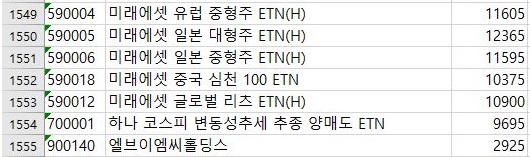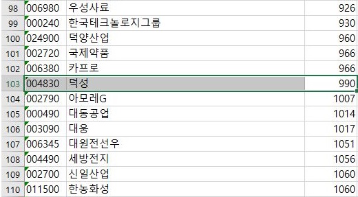 먼저 해야 할일은 위 스크린샷에서 볼 수 있는 것과 같이 일단 가격을 기준으로 오름차순 정렬을 해서, 1주당 1000원이 되지 않아서 모의투자에 적합하지 않은 종목은 탈락 시키도록 합니다.