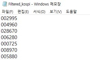 확인결과 중복된 종목이 없었고, 그래서 이번에는 종목의 코드 리스트만 가지고서 txt파일에 앞으로의 작업을 위해서 한번 저장해 주도록 합니다. 이렇게 하는 것으로 이제 코스피에서 모의투자 대상으로 - 즉 분봉차트를 가지고 올 종목을 일단 선정하는 데 성공했습니다. 이제 코스닥이 남아 있다고 할 수 있습니다.