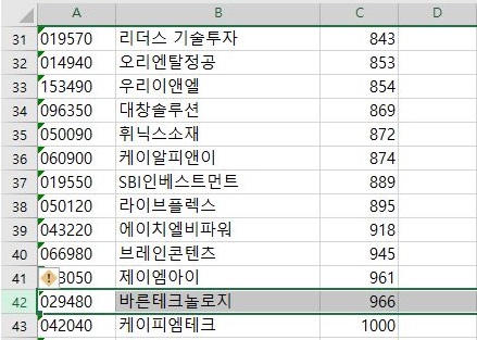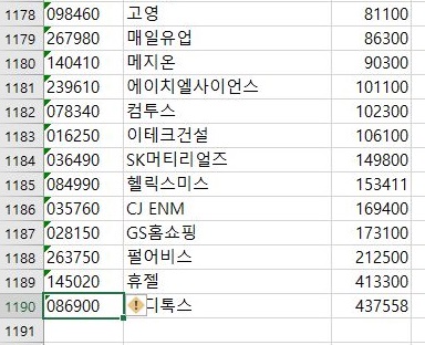 엑셀에서 먼저 데이터 정렬을 하는 것으로 일단, 1주당 가격이 그냥 1000원 미만인 코스닥의 종목들을 모두 제거해 버리도록 합니다.
