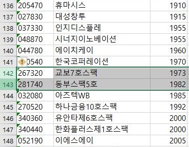 그리고 나서 스펙이라고 이름이 뒤에 붙은 이 일종의 펀드같은 종목들을 모두 제거해 주는 단계에 들어가 보도록 합니다. 이 작업은 수작업으로 해서 좀 정확하지 않을 수 있습니다.