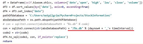 그리고 나서 다음으로는 이제 분봉의 단위에 따라서 데이터 베이스의 이름이 바뀌도록 코드를 바꾸어 주도록 합니다. 이렇게 하는 것으로 이제 작업이 거의 끝나 갑니다.